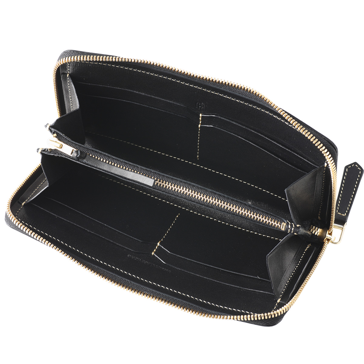 ウォレットのインナーは全てファスナーにて閉じられていますので内容品のセキュリティを確保しています。ファスナーの引き手にはオリジナルのファスナーノブが付属します。ファスナーは高級なエクセラファスナーを使用しています。